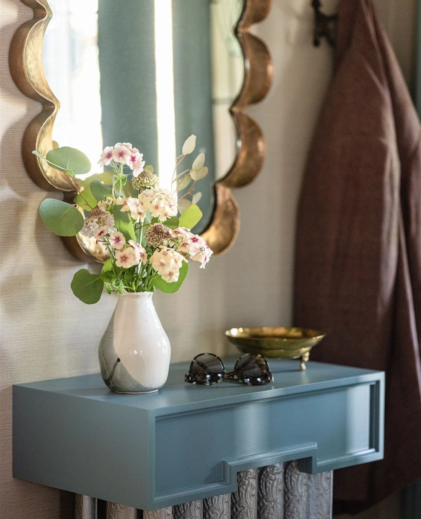 View fullsize This entryway is having a moment. A custom radiator cover matches the original millwork -- giving the homeowners a place to set their keys and sunnies when they walk in the door. The scalloped mirror adds a playful touch.