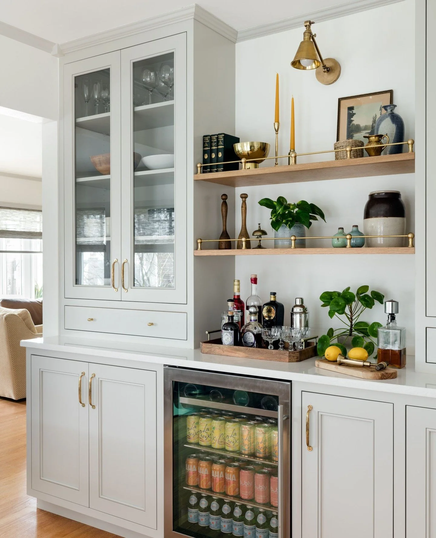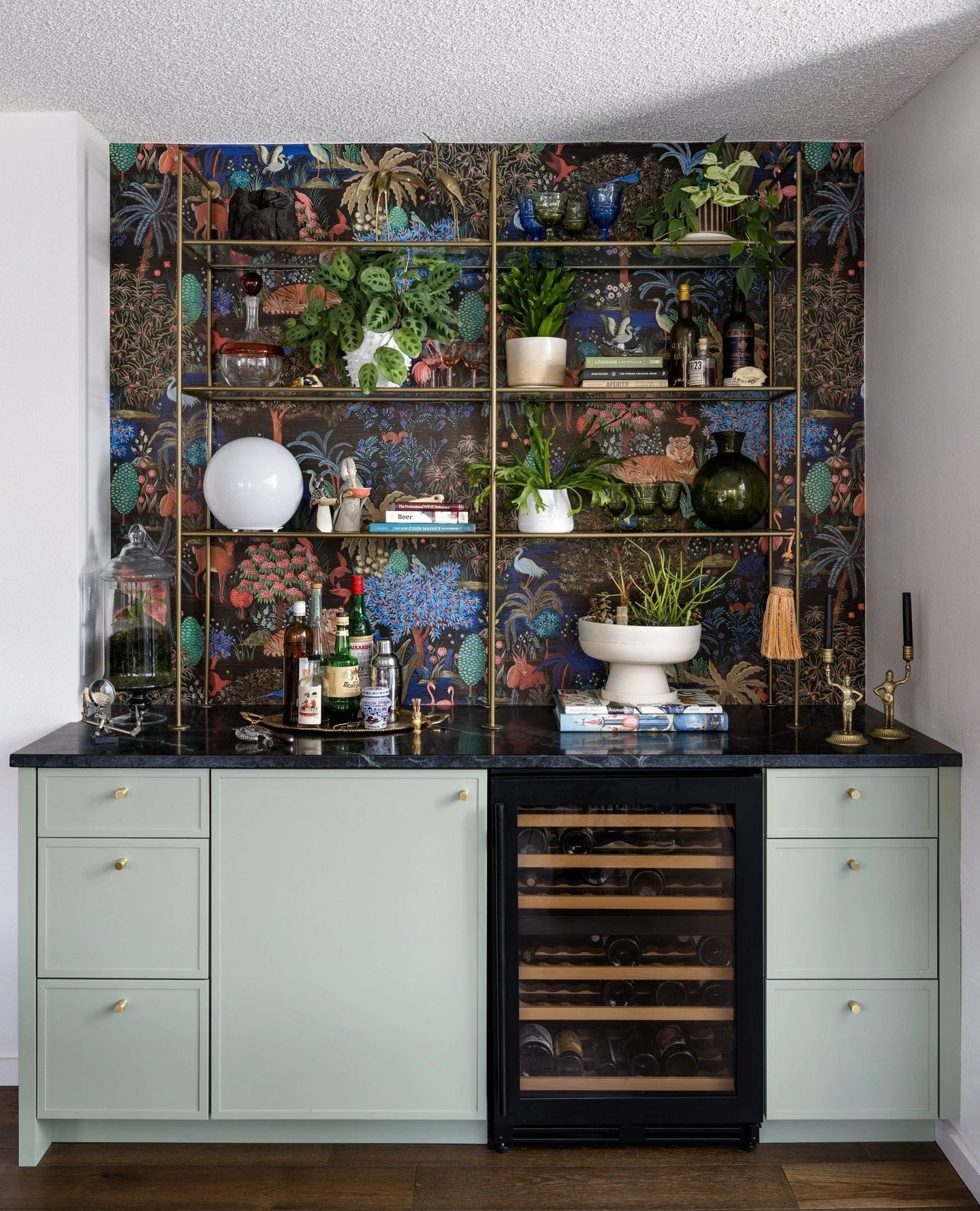 View fullsize The bar in this MCM condo remodel was designed for with fun and function in mind. The playful Pierre Frey wallpaper and brass shelves are the perfect backdrop to display my client's amazing collection of vintage glasses and collected objects. It's al