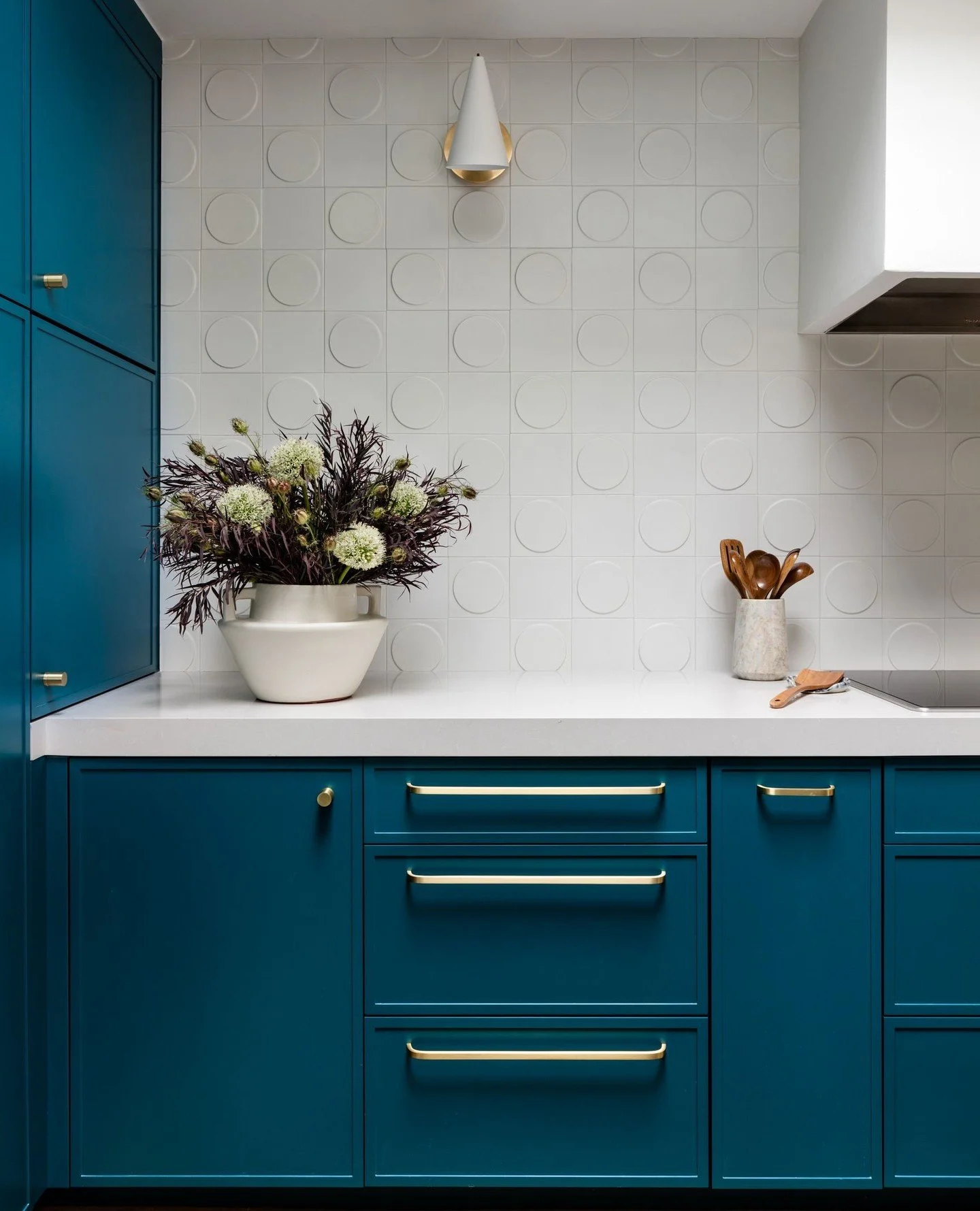 View fullsize The dimensional tile adds an extra layer to this dreamy teal kitchen.