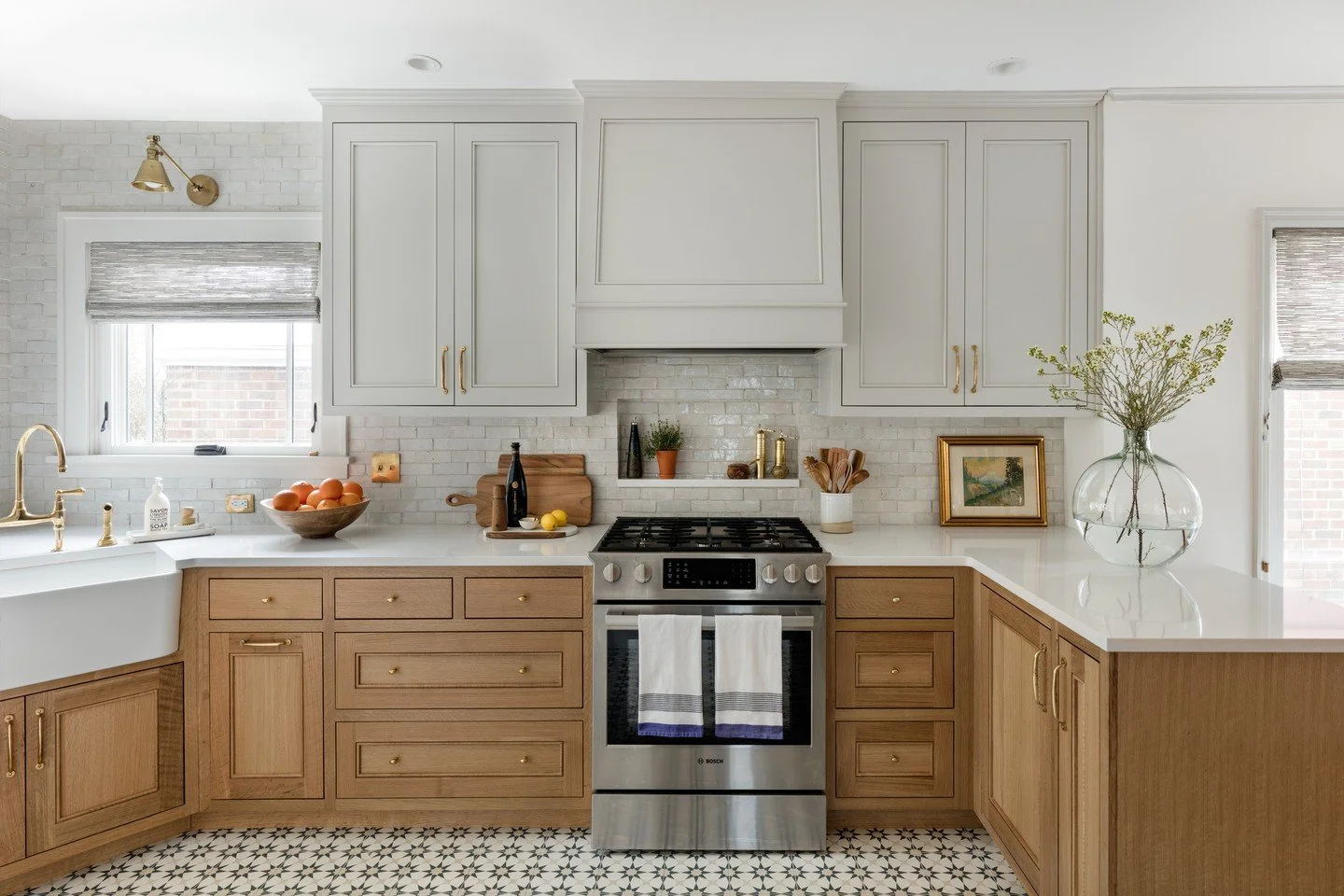 View fullsize A patterned floor was a must for the homeowners of this Craftsman home. We started there and layered in warm woods, textured tiles and soft window coverings to finish off the design.