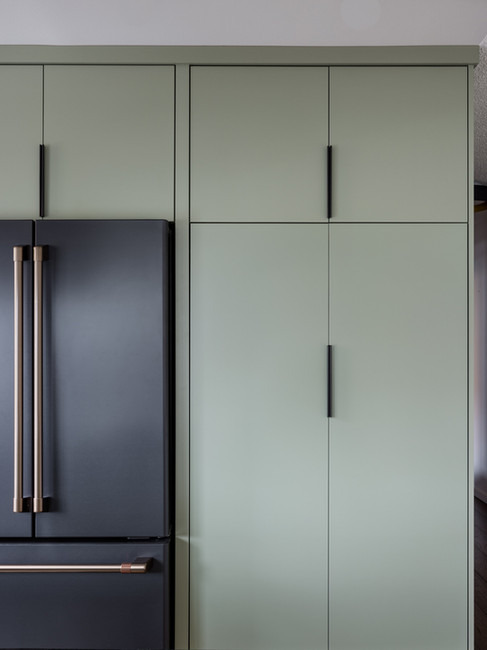 Storage was reimagined from the ground up. A “super-pantry” near the refrigerator consolidates dry goods, coffee supplies, and daily essentials in one beautifully organized zone, while a dedicated cleaning closet offers a smart home for everything from the vacuum to step stools. The cabinetry mixes slatted walnut with soft sage-green finishes, creating a palette that feels both mid-century inspired and completely contemporary.